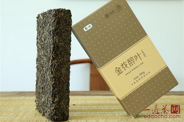 打开金花醇叶那富有金花元素的包装,持茶砖观察其品相,茶砖形态完整,青褐尚润,其叶梗较多,散布茶砖上,有梗不代表茯砖茶品质差,适量茶梗有利于菌花发酵,更有利于茶品品质。