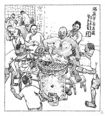 满庭芳(坊)在今天上海福建中路广东路这一带,这个臭豆腐摊很气派,贺友直能回忆到的细节都在画里。贺友直说,“至于摊主的敬业精神只够状其外貌无能表其内心了。总之,我有几年时间路过此地,总是见他一如既往地油炸臭豆腐热忱周到地应付顾客,就此而已。”