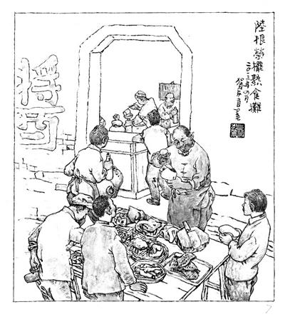 贺友直好酒,年轻时候一顿饭一斤黄酒不可少。1952年11月,他刚到公私合营的新美术出版社工作,一周要上6天班,平日夜里头硬性自我克制,因为一沾酒就没时间画外稿赚稿费了,不能因小失大。但周六周日晚上就可以放开喝酒。这下酒菜,多数是下班时路过看中买下带回,数上海大世界西边对面的熟食名店“马泳斋”,光顾得最多。