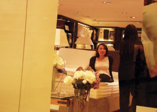 有爱情滋润的她,特别风骚,日前下午现身中环太子大厦购买大床,配合其六呎高的猛男男友;当中看中一张价值逾十万多元的双人床褥连大柜,她不惜成个人躺上床感受,趟足十分钟,状甚享受。