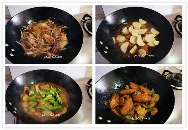 6. 待鸡翅上色后,加入土豆片继续焖煮。