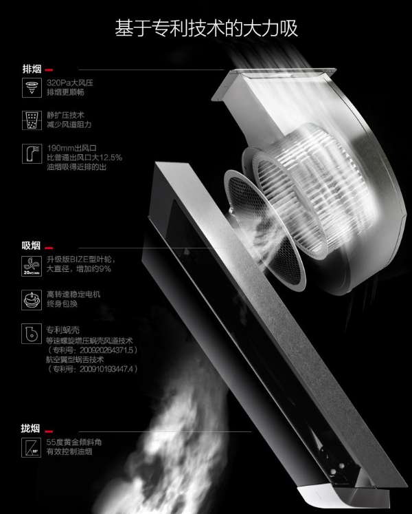 美的 DJ370R油烟机为升级版BIZE型叶轮,118mm大直径,60片叶片,采用优质威灵电机,运行平稳,吸力增加约9%,专利蜗壳,等速螺旋增压蜗壳风道技术及航空翼型蜗舌技术,能有效提高吸烟效果,55度倾斜角,拢烟更有效。