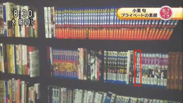 在节目的截图中可以看到漫画书柜里基本都是非常健康(?)的全年龄向漫画,在第二层里出现了一本《银魂》的漫画,从书脊看是单行本第1卷。而银魂后面则是9本《死神》,难道小栗旬本人其实爱《死神》超过《银魂》?