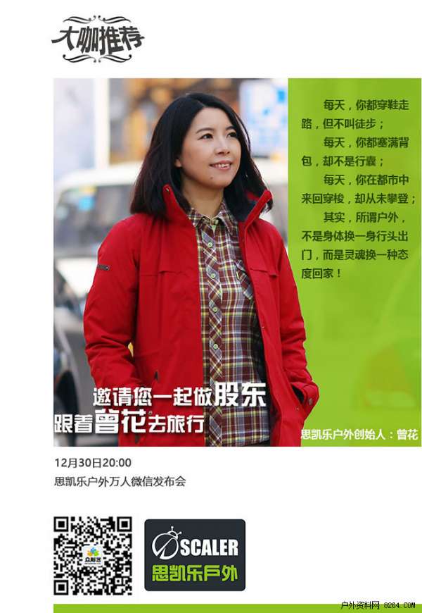 行业综合类领军品牌思凯乐近期推出了一个全新店面模式--出行生活馆,将锁定日益增长的出行需求,帮助准备出行的消费者带来一站式出行服务。在这里,您不但能一站式找齐出行所需装备产品,还能够帮助您发现您想要的出行路线,找到和您一起去看世界的人!店面将全面打通线上和线下的互通渠道,引入智慧门店的管理和运营模式,打造更为直接和智能的出行服务平台,并带来户外兴趣分享社群的聚合平台。该模式首家店面将以开放众筹形式在全国启动投资招募,12月30日晚20:00,思凯乐出行生活馆万人线上众筹即将开启,思凯乐品牌创始人曾花将于线上同步发布该店众筹信息。