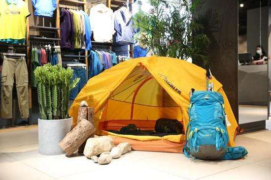 进门后,原来的两个可以移动的大木箱已被宽旷的露营生活的场景替代,专业的高山帐、60L的大背包、登山杖和山石、绿植一起,栩栩如生地构造出一幅户外露营生活的画卷。“我们希望用这样的场景来唤起大家更多户外生活的共鸣!”场景之外,是思凯乐当季的产品系列,安静地在墙面货架上,以不同的色彩和款式期待着一场知遇的旅程。