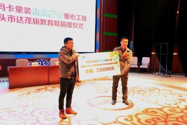 据悉,为响应教育部、国家体育总局、共青团中央颁发的《关于全国亿万学生阳光体育运动》的号召,倡导“阳光体育&健康校园”主题系列活动,玛米玛卡童装携手北京师范大学共同发起了中国“未来之星爱心工程”公益活动将历时五年,行程覆盖全国各个省份,近千所学校,捐赠总价值约为3000万元的运动服装及用品,成为近年来我国儿童用品产业最大规模的公益事件之一。在此次的内蒙古公益捐赠中记者看到,玛米玛卡童装向包头市达茂旗教育局8所中小学校捐赠了价值230000元的运动服装及运动装备,向每个学校各捐赠运动装备50套、篮球套装10套、足球套装22套,为学校推进阳光体育活动提供物质支持。北师大与会领导在接受媒体采访时表示,希望通过“未来之星爱心工程”活动的影响力,推动更多爱心人士、爱心企业关爱中国少年儿童,并参与到“少年中国梦”的建设中,通过实际行动来增强中国儿童体质,关爱儿童健康,成就儿童梦想。