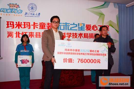 据悉,这是继走进“内蒙古大草原”之后,玛米玛卡本年度“未来之星爱心工程”举行的又一次大型捐赠公益活动。据了解,玛米玛卡童装此次公益行动将分别向河北怀来县教育和科学技术局27所农村学校,捐赠物资价值760000元的运动服装及爱心运动装备。