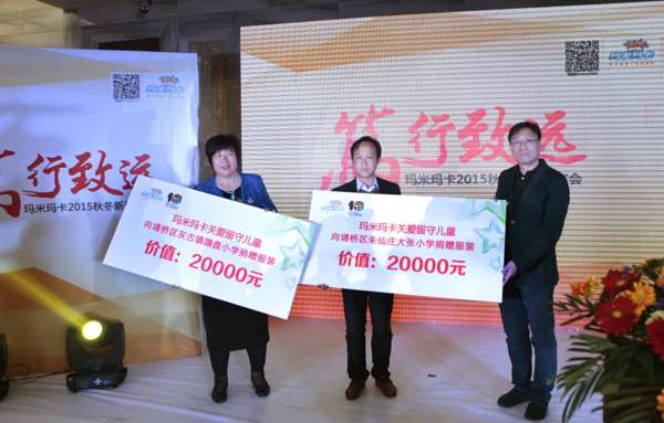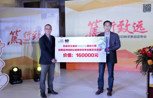 发布会上,玛米玛卡“未来之星爱心工程”捐赠宿州市埇桥区健康教育事业服装及装备价值16万元,为埇桥区推进阳光体育活动提供物质支持。同时玛米玛卡关爱留守儿童,向埇桥区朱仙庄大张小学与灰古镇蹍盘小学各捐赠价值2万元的服装。活动现场,朱仙庄大张小学沈艳芳校长讲话中指出,朱仙庄镇大张小学作为安徽省优秀留守儿童学校,多年以来十分注重对留守儿童的关爱与呵护,同时感谢宝德集团及社会各界对朱仙庄大张小学的爱心、关心与责任心!