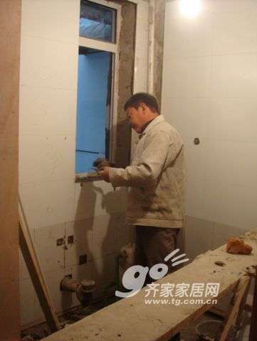 贴的差不多了,贴墙砖的师傅就是粉墙的那位师傅。