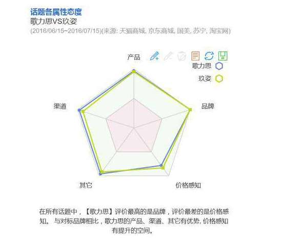 从话题属性来看,消费者对这两个品牌最关注的就是它们的产品,而且对产品的评价都很很好,说明玖姿和歌力思的产品已经赢得了消费者的心,但是从话题态度图来看,消费者对玖姿和歌力思的价格感知评价都很差,说明消费者对这两个品牌的价格并不满意,而且从负面评价中也可以明显看到消费者贵、不值这个价的评价,说明这两个品牌都存在性价比不高的问题,应该改。
