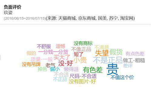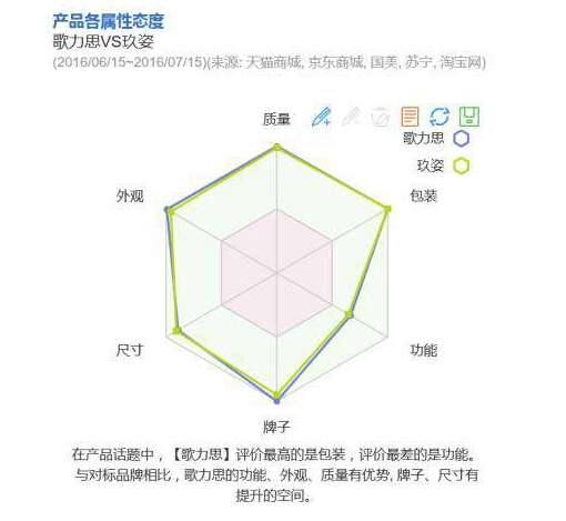 消费者最关注的就是产品质量了,从产品属性态度可以看到,消费者对于玖姿和歌力思的产品质量还是很满意的,说明这两个品牌都很注重产品质量,而且外观、尺寸、包装方面的评价也都很好,但是功能方面的评价却都是最差的,说明这两个牌子的衣服实穿性不强,漂亮、质量好,但是不太实穿,玖姿和歌力思在衣服实穿性方面有待加强,衣服再好看,买回去不常穿的话也不利于吸引回头客。