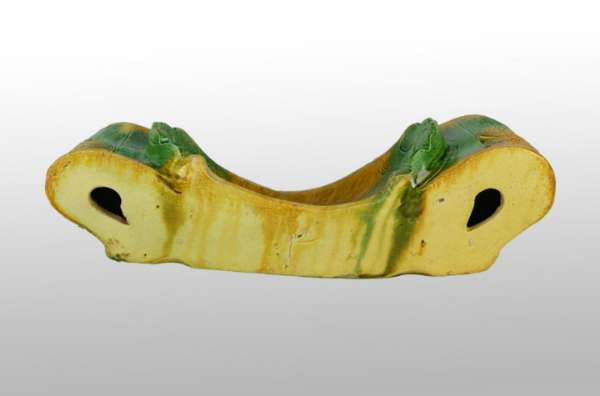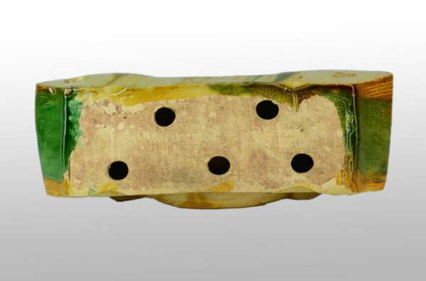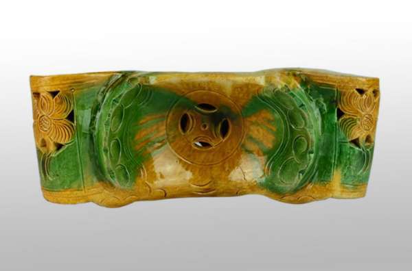 此素三彩瓷冥枕,造型独特,用彩素雅,纹饰精美,线条硬朗,是一件既美观又实用的器物。明代时期,用作高端房子房顶上面的构件,胎质致密,其分量上不轻不重,恰到好处。以镂空雕饰铜钱纹,寓意丰富。整体色调鲜明、细腻匀润,水绿浅淡如湖水色,且釉与胎结合紧密,彩釉润亮,极具艺术观赏价值,是难得一见的珍品瓷器,值得收藏。