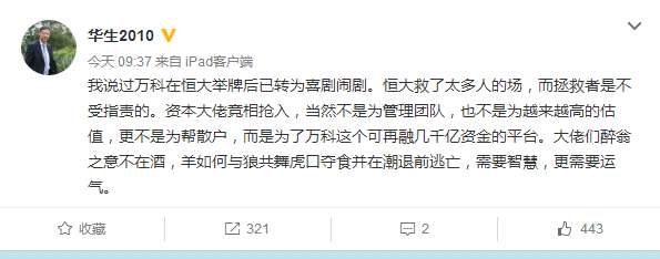 8月16日,华生发微博称:我说过万科在恒大举牌后已转为喜剧闹剧。恒大救了太多人的场,而拯救者是不受指责的。资本大佬竞相抢入,当然不是为管理团队,也不是为越来越高的估值,更不是为帮散户,而是为了万科这个可再融几千亿资金的平台。大佬们醉翁之意不在酒,羊如何与狼共舞虎口夺食并在潮退前逃亡,需要智慧,更需要运气。