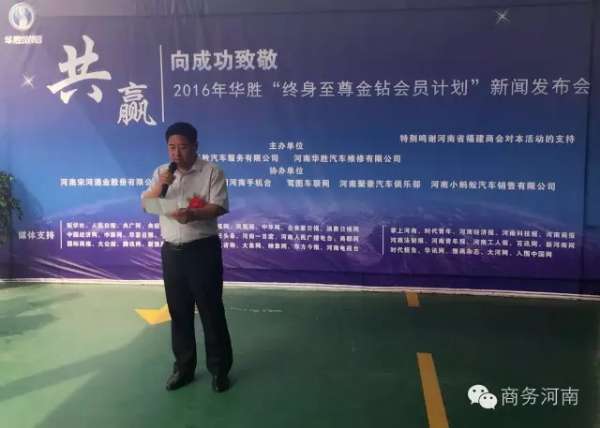 9月17日,由河南华胜汽车服务有限公司、河南华胜汽车修理有限公司主办,大象融媒集团河南手机台、河南宋河酒业股份有限公司、驾图车联网、河南聚豪汽车俱乐部、河南小蚂蚁汽车销售有限公司协办的2016年华胜“终身至尊金钻会员计划”新闻发布会在河南郑州华胜连锁经开店隆重举行。