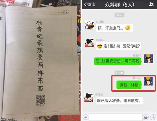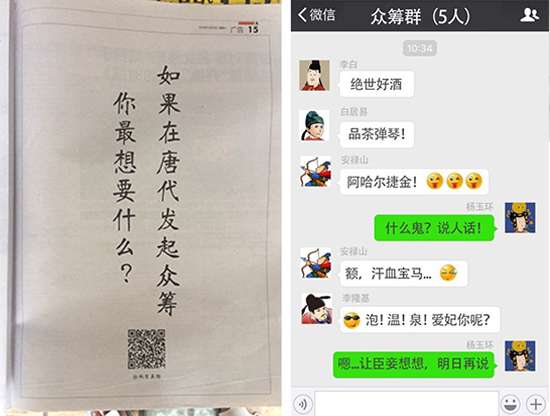 2016年10月15、16、17日三天,一则《唐朝众筹》的悬念刷爆南方都市报头条,是谁掷重金豪包南都报三天头版?15日,“如果在唐朝发起众筹,你最想要什么”的问话一登出,话题热度瞬间飙升,引发网友热议——李白说想要绝世好酒,好酒配好诗;白居易想要品茶弹琴,悠哉悠哉;李隆基想要的是泡温泉!那么杨贵妃呢?网友们纷纷猜测贵妃想要的是金银财宝与皇后之位;更有网友大胆猜测贵妃想要的是LV、香奈儿、迪奥、圣罗兰、兰博基尼、法拉利......果然是脑洞大开!但“唐朝众筹”背后究竟蕴藏着什么?
