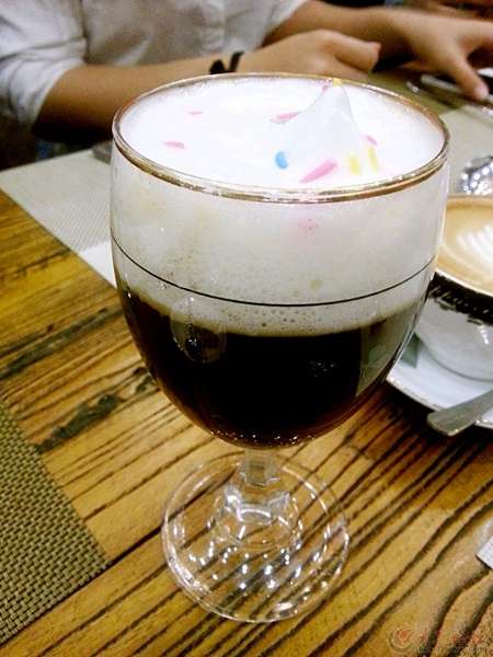 左图是情人的眼泪,里面是加了一种酒调的,喝起来会有一点酒精那种辣的感觉,本人觉得味道还是挺好的。据店长介绍,这款咖啡有个凄美的爱情故事,说是稍后再讲,结果就没有稍后了……店长忘记讲了,到底是个多么凄美的故事,大家去吃的时候问店长吧。右图为塞纳左岸,黑咖啡,真是苦,加了奶和糖还是苦,不过这也是黑咖啡的特点。
