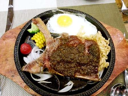 推荐的两款牛排,左图本店特色战斧牛排,因为牛排的形状比较像战斧,所以叫这个名字,据说一头牛只能做出14块战斧牛排,所以供应量比较少。肉质口感比较紧实会有一点肥的,上面酱料的味道像是一种很熟悉的调料味。右图就是大家都会很熟悉的西冷牛排,嫩嫩的口感,西冷牛排的特色,大家应该都会比较喜欢。我想说那个煎蛋不错,火候刚好。
