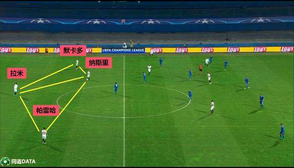 以上图为例,在萨格勒布迪纳摩三名防守队员的围抢下,闲庭信步的将球带出包围圈,与比托洛做二过一撞墙配合后,将球分给左路套边插上的埃斯库德罗,得球后的西班牙人将球传至中路,巴斯克斯完成头球攻门。威胁进攻的源头正是源于纳斯里出色的脚下技术和灵活的拉边跑位。