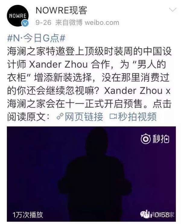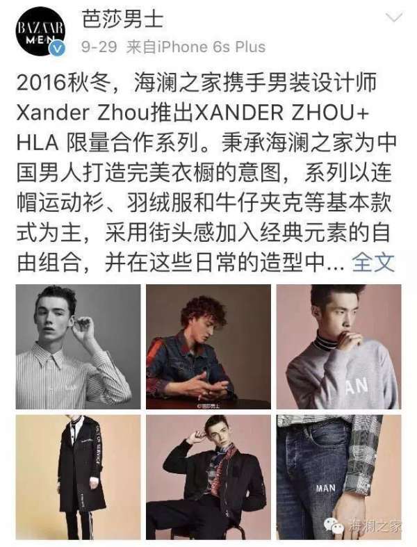 男装设计师XanderZhou合作推出首款设计师联名系列:XANDER ZHOU+HLA限量合作系列。