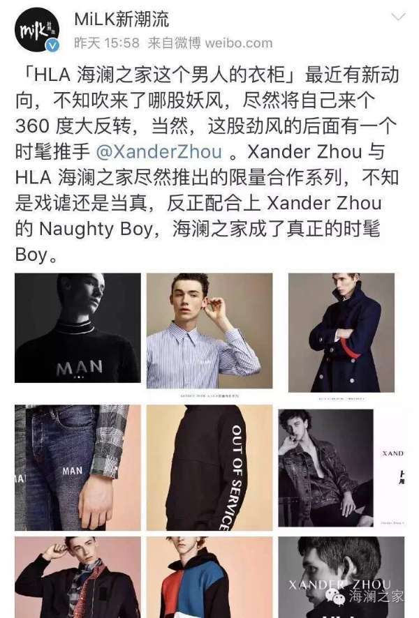 如此密集的持续曝光让XANDER ZHOU+HLA系列无处不在,在京东只售卖一天的情况下全部售完!这款成衣在海澜之家以往的国民属性之上,吸引了更多潮流圈的目光。而基于海澜之家与XanderZhou的理念融合,这款限量合作系列的产品本身也体现了更多潮流的发展可能。