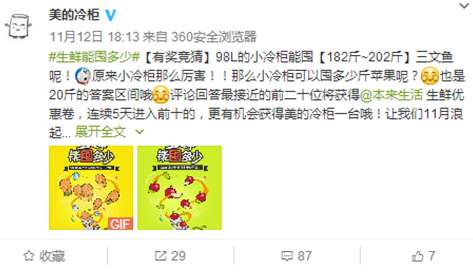 日至14日期间,美的冷柜每天在官方微博开展#生鲜能囤多少#线上竞猜活动,每天答案最接近的前二十位用户可获得本来生活网生鲜优惠卷,而连续5天进入前十的用户,更有机会获得美的冷柜一台。有趣的抽奖和问题,引发了网友积极讨论,“98L的美的冰柜到底可以囤多少