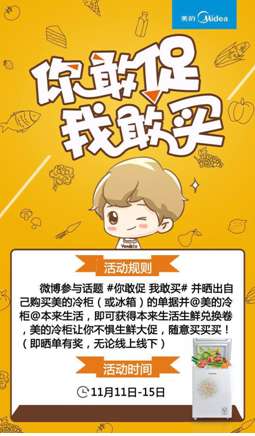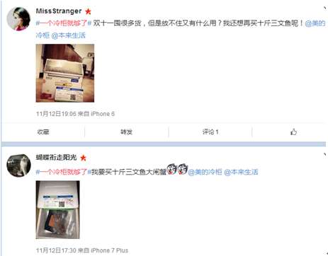 同时,对于购买美的冰柜的用户,回馈力度更给力。11月11日至15日期间,用户可以同时在美的冷柜和本来生活网微博上参与#你敢促 我敢买#活动,用户晒出购买冷柜的单据,可以获得高额本来生活网促销卷以及美的冷柜抽奖机会。优惠力度更大,获奖几率更高,许多用户表示找不到单据好着急啊。
