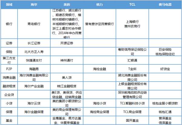 与互联网公司布局金融业务时更偏向互联网金融不同,家电企业的金融布局更加全面,传统金融业务与互联网金融业务兼具,领域涉及银行、证券、