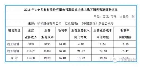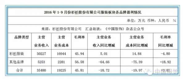 业内人士向《中国服饰》杂志记者表示,杉杉股份服装业务自2012年以来一直处于调整期,盈利状况尚需底部反转。随着杉杉不断调整服装业务,预计未来其服装业务盈利状况有望得到一定的改善。《中国服饰》杂志记者获得的数据则显示,2016年1-9月,宁波杉杉股份有限公司服装板块门店主营业务收入为24,074万元,占公司主营业务收入总额的比重为7.15%,