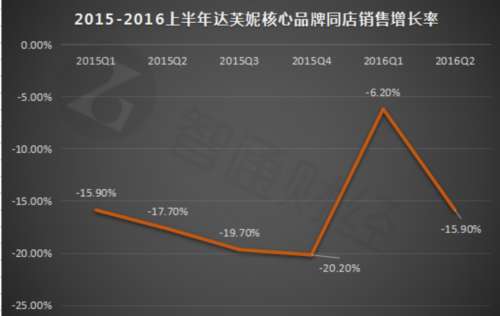 即便如此,达芙妮同店销售业绩仍在下滑。自2015年起,达芙妮核心品牌的同店销售业绩的同比降幅就在不断扩大。2016年第二季度,其核心品牌同店销售业绩同比下降15.9%。