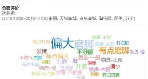 ,主要负面评价是在产品和物流方面,偏大,磨脚,开胶,物流慢都成为用户的吐槽点,说明