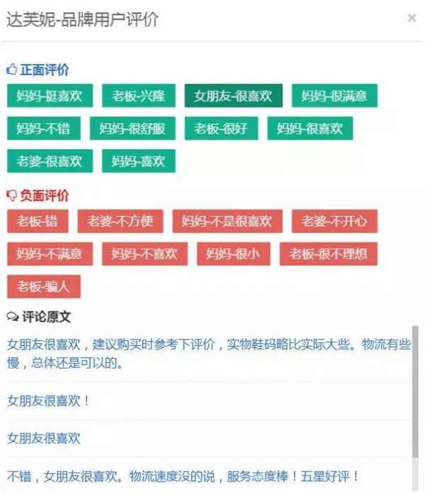 在性别分布上,达芙妮的男女比例各占50%,对于一个女鞋品牌来讲,这样的性别比例是很难得见到的。根据用户对品牌的评价可以看到,造成这种情况的主要原因是很多男士买来送给另一半或者妈妈,说明