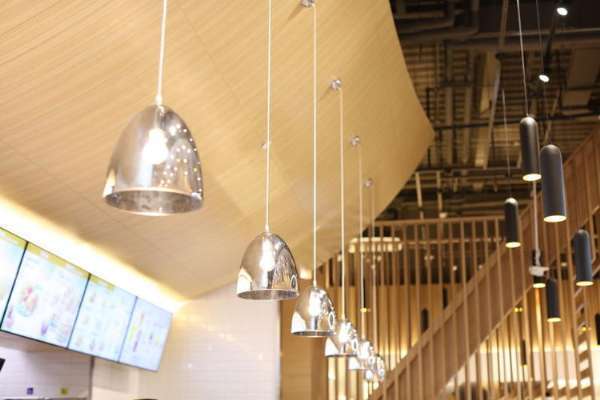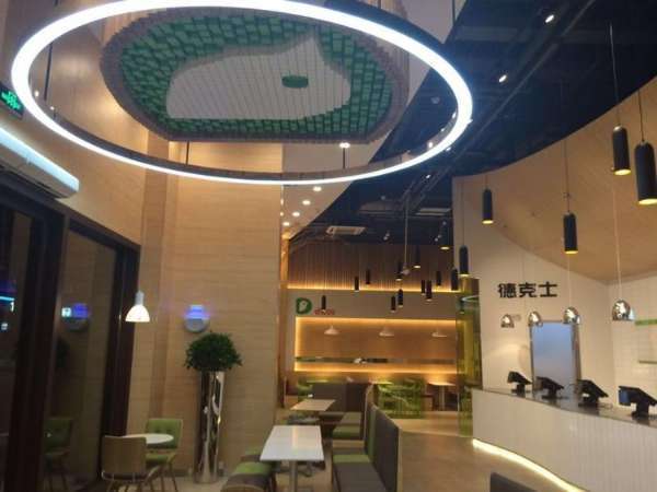 我们看到,德克士绿色小鸟 logo 做成了像素图的样子,悬挂在入口处,并摆放了几棵大树来营造森林的感觉。德克士称,店内的特色还在于不同款式的吊灯,比起第一家店,灯光颜色更加的暖。但是,木质桌子、绿色的椅子以及不规则沙发,和成都店相比没有太大区别。而整体的装修成本比一般门店高出了 50%,容客量也减少了近 30%。