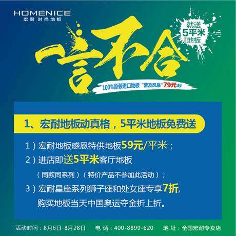 8月将是巴西奥运会的开幕日,宏耐时尚地板为助力奥运,特推出中国奥运健将荣获金牌者专属星座系列地板,童鞋们购买还会再打9折。与此同时,戴安娜家居100%原装进口地板“普及风暴”,特价地板79元/平米起,除特价外其他面积在原价基础上再打6.8折。购地板还能砸金蛋,预付2000元货款就获得一次砸金蛋机会,有机会赢取4999元的免单大奖和众多豪礼,而且100%中奖。