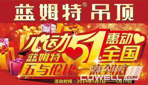 在五一节假日即将到来之际,为了答谢广大新老客服对蓝姆特的关爱与信任,以及让更多的消费者享受到蓝姆特吊顶带来的极致生活体验,2014年五一期间,将在全国范围内开展“心动五一,惠动全国”的主题大型促销活动。届时,只要您去到全国任何一家蓝姆特专卖店,您就能享受到无与伦比,一惠到底的绝对优惠价格,给广大消费者的节假日居家购物带来一场特惠饕餮盛宴。