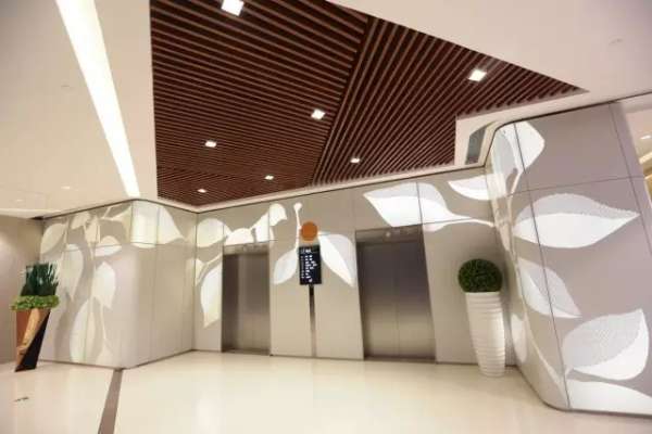 树影以镂空雕刻形式映射在电梯厅的铝板墙面,内部更嵌入变化多端的灯光设备,观光电梯就像隐藏在蔓延的枝干和摇曳的树叶里,仿佛能将消费者带往他们想去的任何地方。