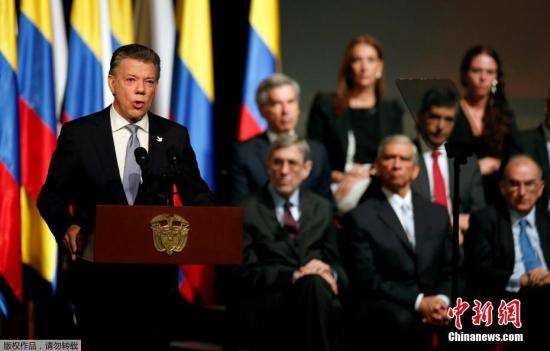 哥伦比亚总统桑托斯发表演讲。新和平协议的签署,结束了哥伦比亚长达半世纪的冲突。