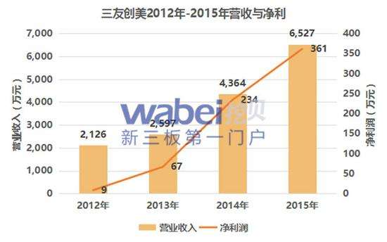 挖贝新三板研究院数据显示,三友创美2012年-2015年分别实现营业收入2125.96万元、2596.56万元、4363.89万元、6526.79万元,实现净利润8.67万元、66.88万元、233.95万元、361.32万元(见下图)。
