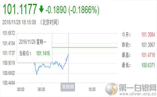 周一(11月28日)因美元指数从13年高位回落,推动金价触底回升,国际现货黄金一度上探至1197.54美元/盎司,但随着日内美元指数回升,金价跌破1190美元/盎司关口。