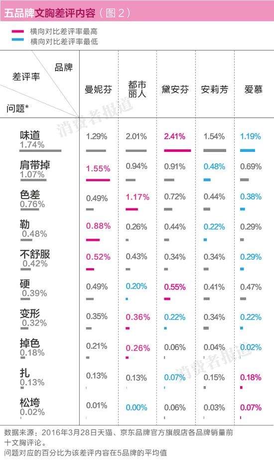 数据分析发现,“有味道”、“肩带易滑落”、“色差”三个问题分别为差评内容的前三位。曼妮芬多被消费者提及容易掉肩带、太勒和穿着不舒服;都市丽人文胸和网店图片有色差,容易变形和掉色;黛安芬文胸“有味道”且“太硬”;爱慕文胸有些“扎人”,且会“松松垮垮”。(如图2)