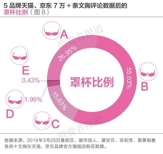 《消费者报道》试图以小见大,通过在曼妮芬、都市丽人、黛安芬、安莉芳、爱慕五品牌在天猫,京东的官方旗舰店七万多条购买数据,分析女性对文胸的“色”取向和罩杯大小。
