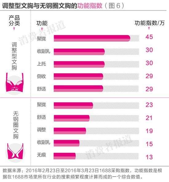 2016年3月阿里指数显示,不论无钢圈文胸,还是调整型文胸,“聚拢”都是最重要的功能需求。(如图6)