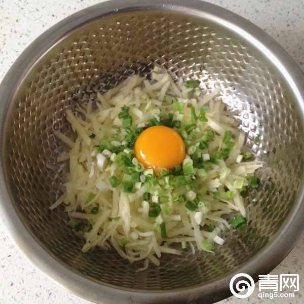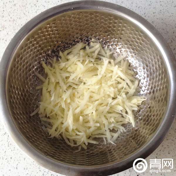1、土豆刮皮刨成细丝,用水冲洗控去水份后放入容器中。