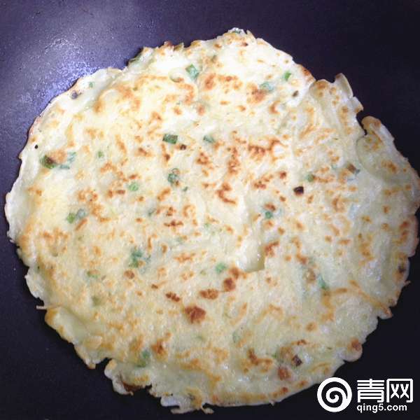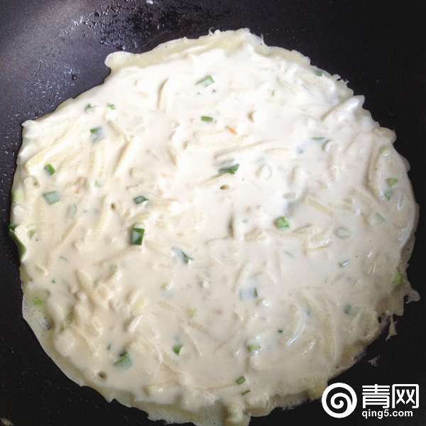 4、锅里涮上一层油,放上2大勺面糊,用锅铲摊平。