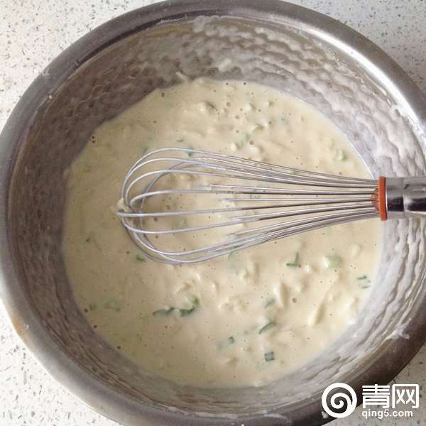 3、加入两大勺面粉,一边倒入清水一边搅拌,直到成为比较稠的面糊。