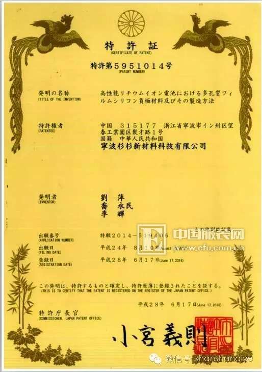 2016年,杉杉科技又相继获得日本和韩国的专利权各一项。