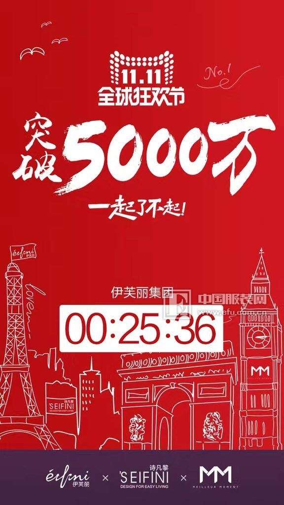 向中国服装网表示,截至0点25分,双十一成交额整体轻松突破5000万。其中,伊芙丽3分56秒突破1000w,19分钟57秒达到4500w,突破2015年一小时的业绩。