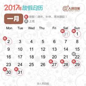 2017年假期日历来啦!春节:1月27日至2月2日放假调休,共7天。1月22日(星期日)、春节:1月27日至2月2日放假调休,共7天。1月22日(星期日)、放假安排。2月4日(星期六)上班。清明...