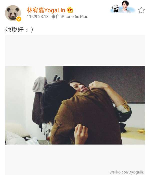 ,两个人开心地拥抱在一起,微博只有三个字:“她说好:)”,这大概是我这一年里看到的最Sweet的微博了。