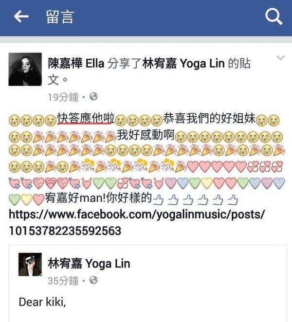 陈嘉桦转发送上祝福,用超多的表情符号表示了自己有多感动,一边说Yoga好man,一边让丁文琪快答应他,真真儿是说出了迷妹的心声。