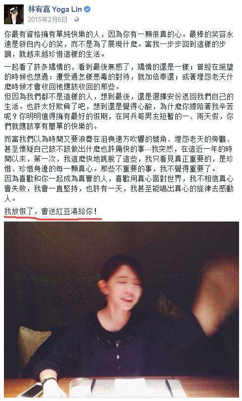 和丁文琪2014年5月份在一起,2015年林宥嘉在脸书发了一篇长文,感谢身边有她。那句“我放假了,会送红豆汤给你”真是要把迷妹的心都融化了。
